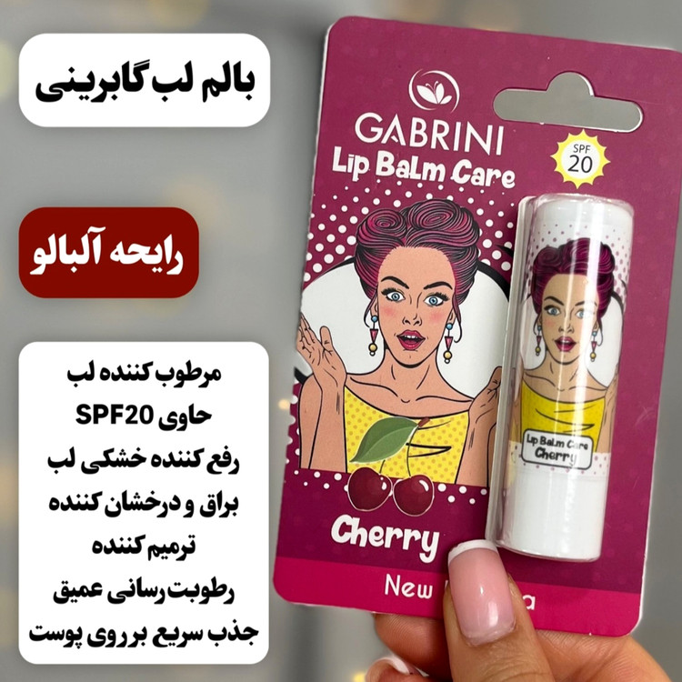 بالم لب گابرینی دارای۴ رایحه ی آلبالو،تمشک،توت فرنگی ووانیل هست تا 8 ساعت لب ها را آبرسانی می کند.