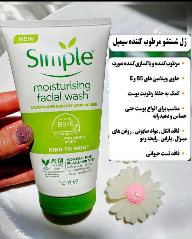 ژل شستشوی سیمپل حاوی مرطوب کننده،پاکسازی پوست،حاوی ویتامینEوb5،کمک به حفظ رطوبت پوست،مناسب انواع پوست حتی حساس ودهیدراته،فاقدالکل،موادصابونی،رایحه وبو.فاقدتست حیوانی