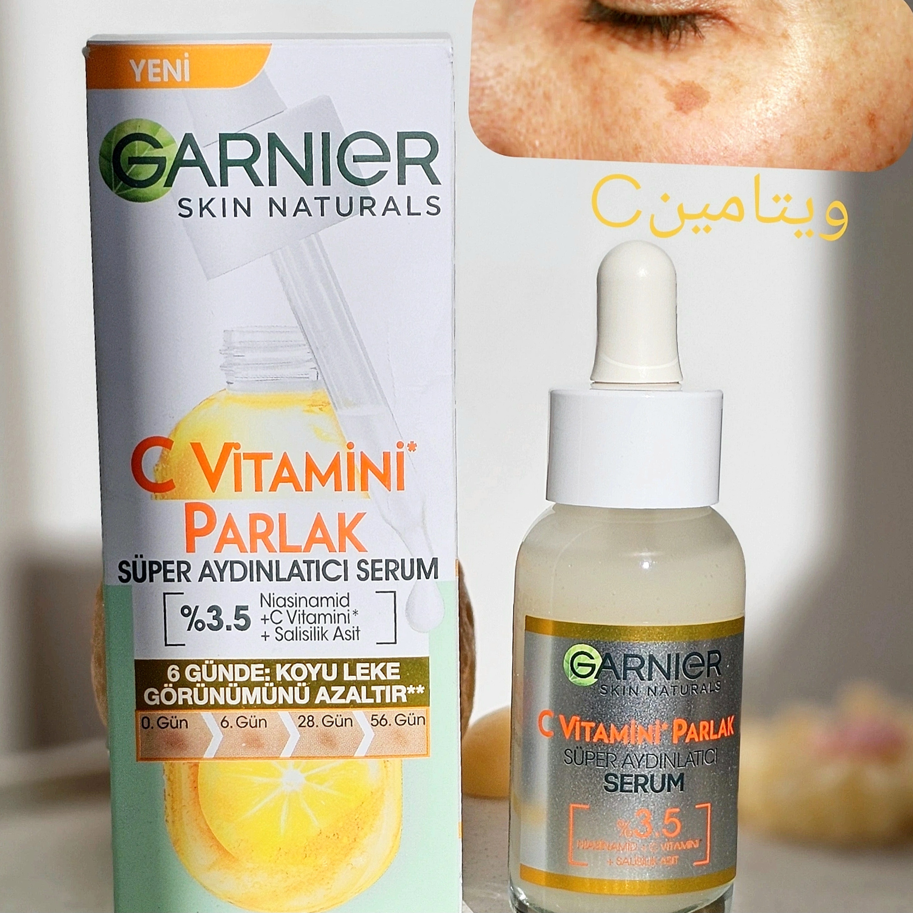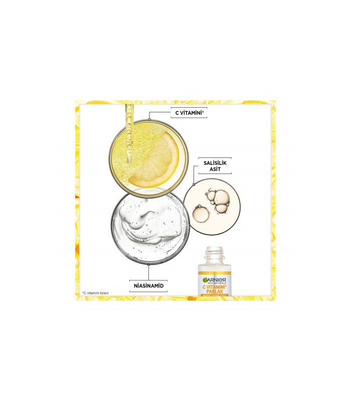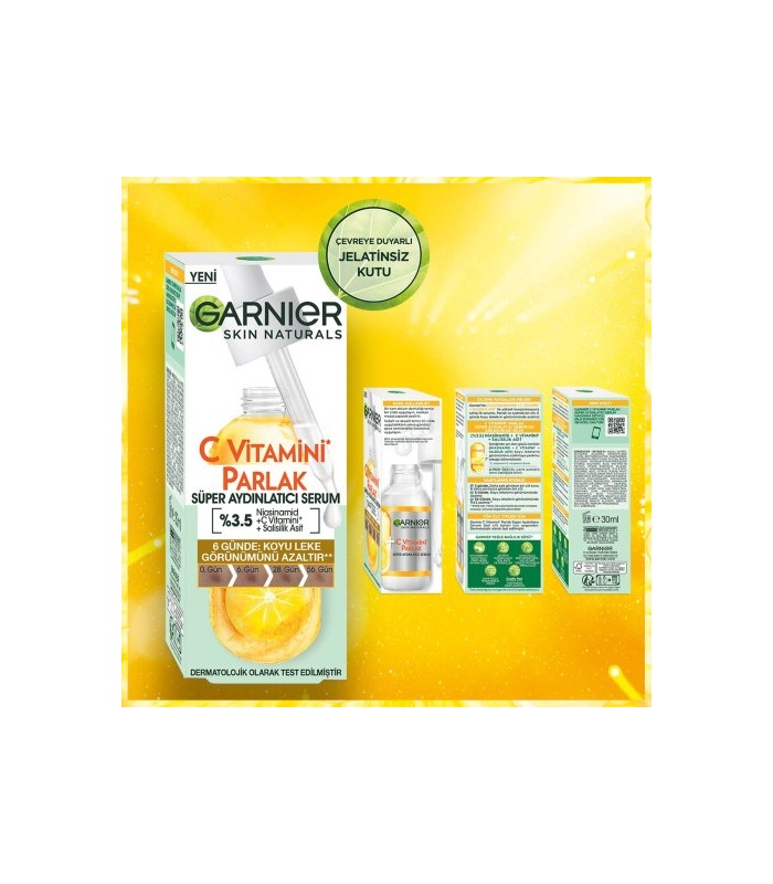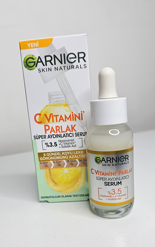 سوپر سرم ویتامین سی و نیاسینامید و سالیسیلیک اسید گارنیر اولین سرم با غلظت بالای 3.5% نیاسینامید + ویتامین C + اسید سالیسیلیک می باشد و در عرض 6 روز باعث کاهش ظاهر لکه های تیره شده و پوستی شفاف و بسیار درخشان خواهید داشت.